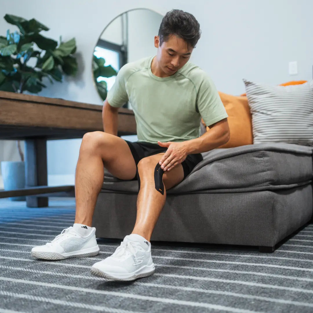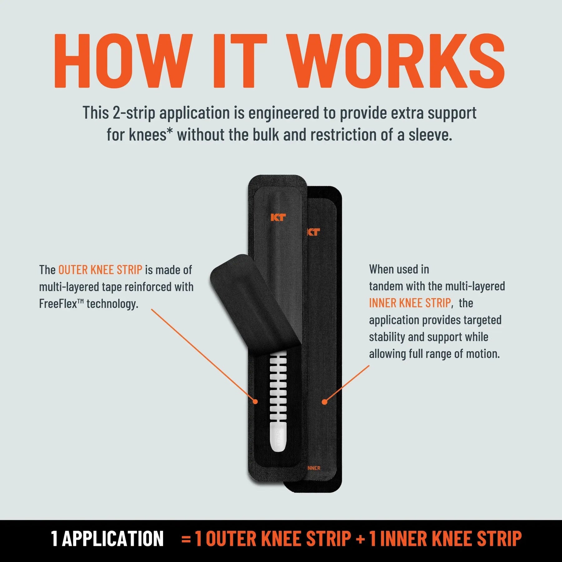 The included quick start guide shows how to apply KT Flex® in the recommended way to promote support and stability in the knees**. Use the 2 strip application system to apply one FREEFLEX reinforced strip along the outside of the knee joint (lateral side) and the other reinforced strip without FREEFLEX along the inside of the knee joint (medial side). The package includes 8 precut strips to equal four knee applications.